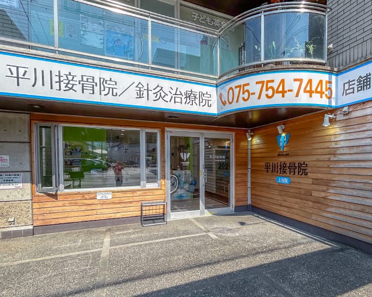 平川接骨院グループ 上桂院は、 上桂駅から徒歩3分。水色のロゴマークの看板が目印です。