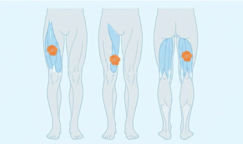 上り下りの際にブレーキをかけたり、体を持ち上げたりする主役の筋肉です。ここに「しこり」ができると、膝のお皿の周辺や奥の方に痛みを感じます。 - 内側広筋(太ももの内側)