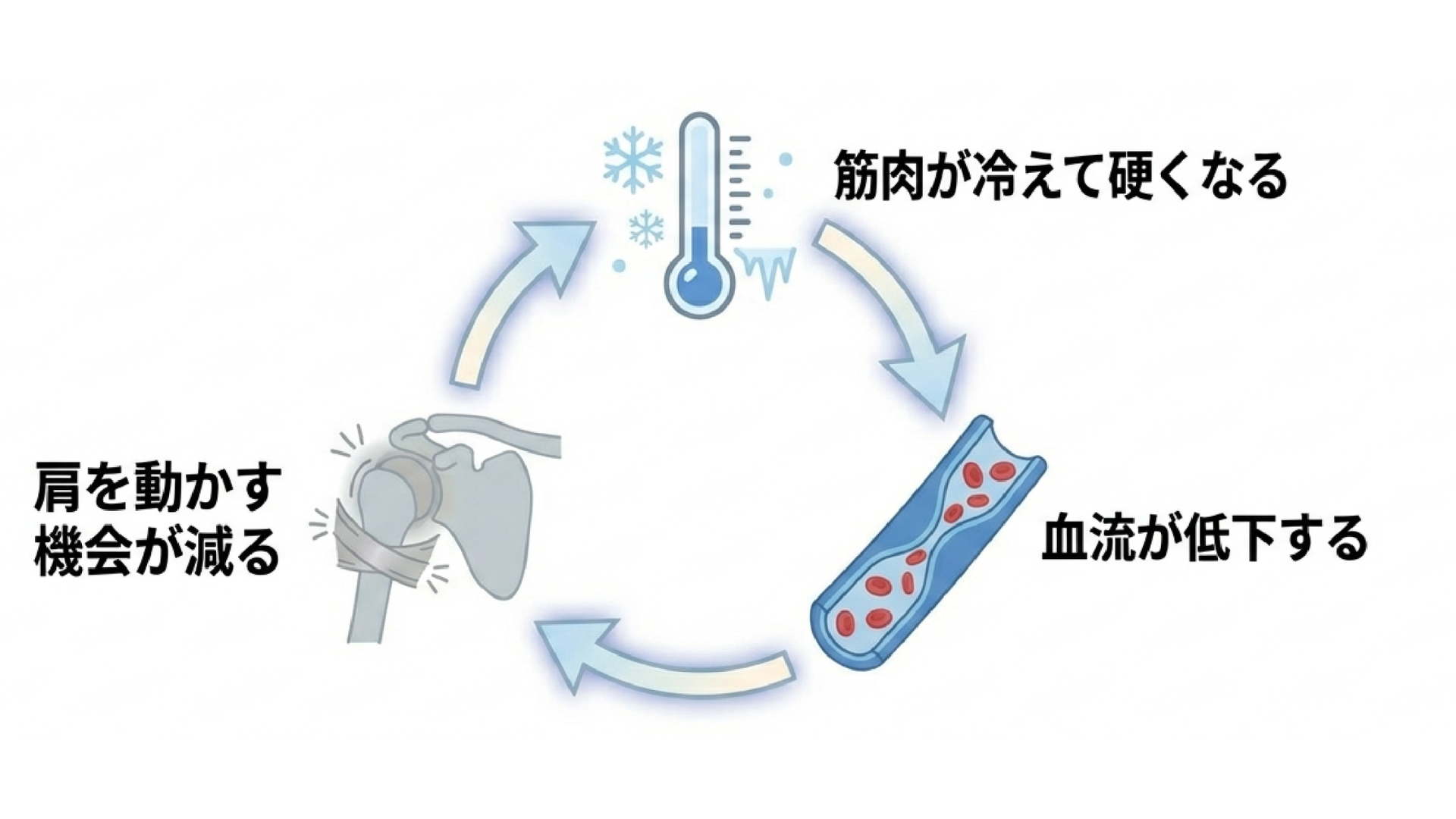 寒さによってこの緊張状態が続くと、肩関節の動きが悪くなり、五十肩の症状が表れやすくなります。