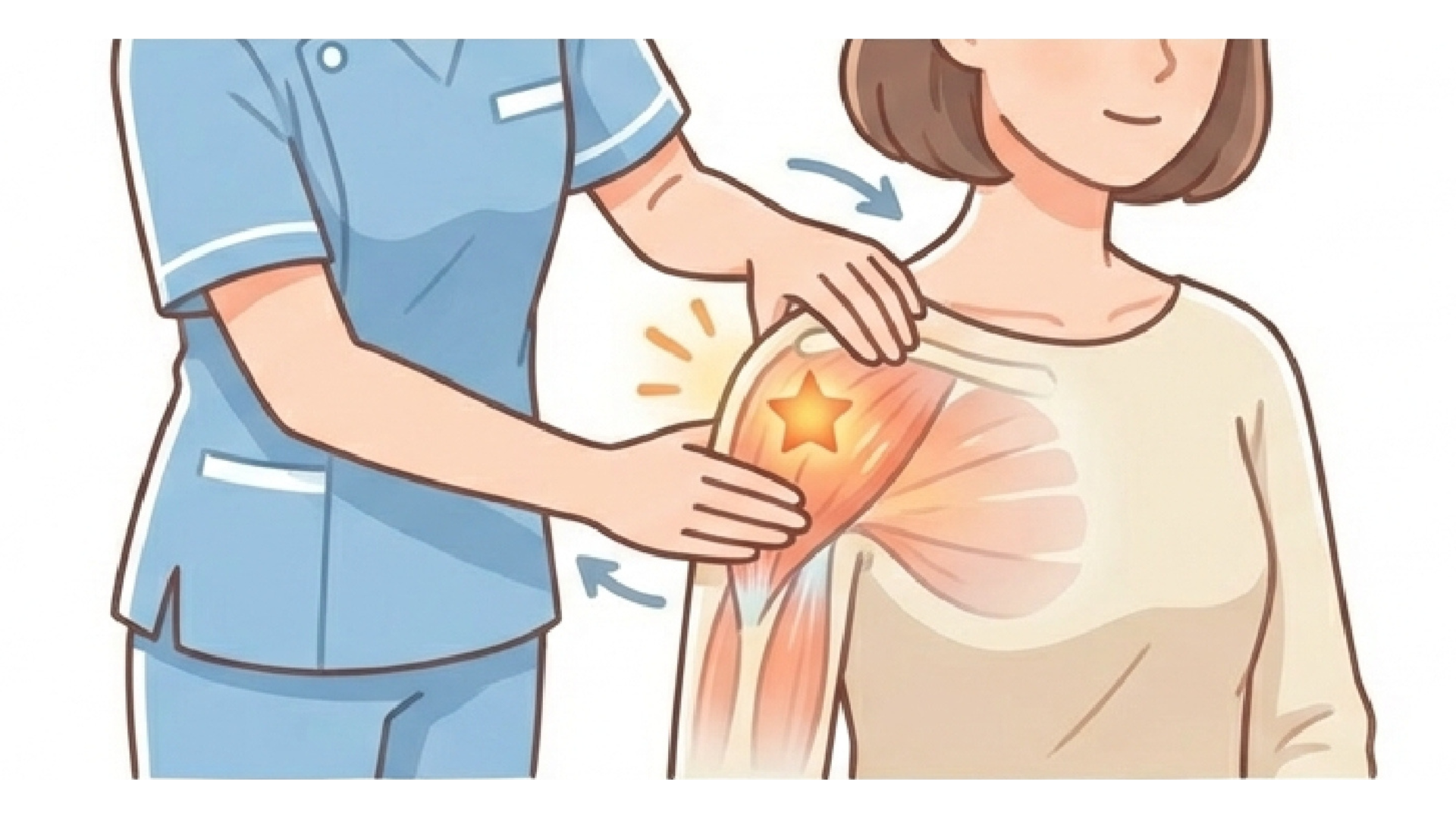 五十肩とは、肩関節の周囲にある筋肉や筋膜、関節包などに炎症や硬さが生じ、
