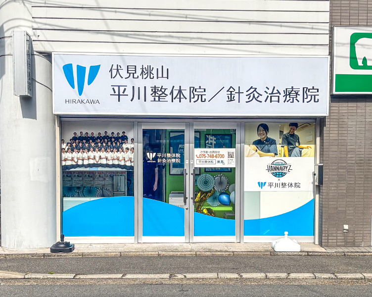 平川接骨院グループ 伏見桃山院は、 伏見区役所から徒歩4分。水色のロゴマークの看板が目印です。