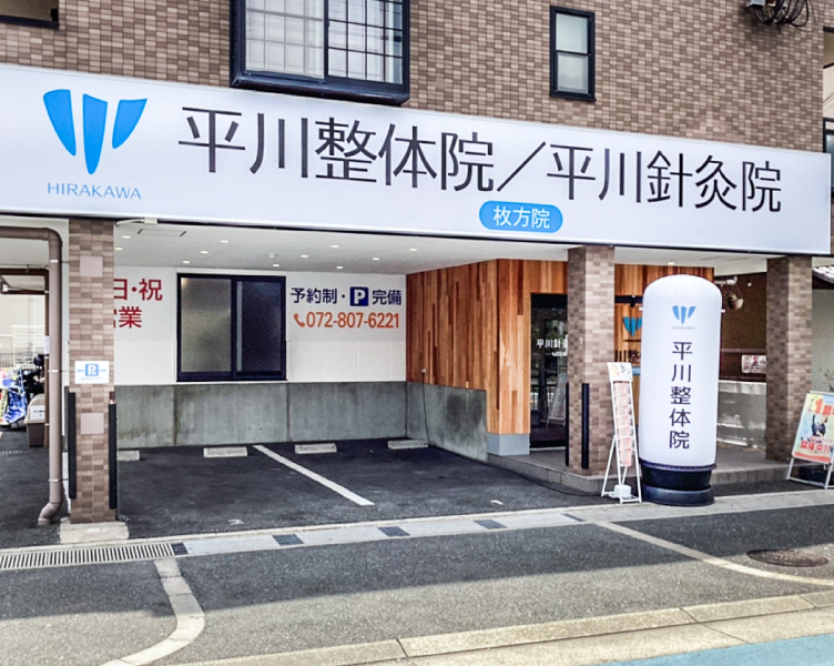 平川接骨院グループ 枚方院は、 京阪バス 都ケ丘から徒歩1分。水色のロゴマークの看板が目印です。